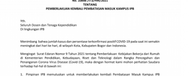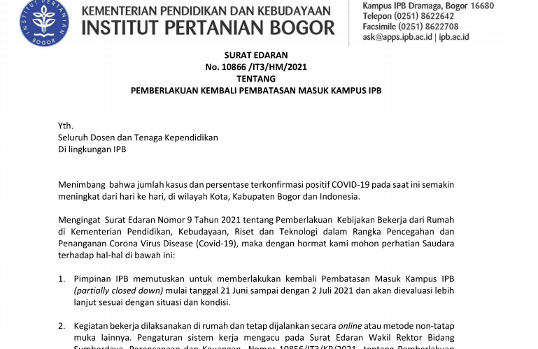 Pimpinan IPB memutuskan untuk memberlakukan kembali Pembatasan Masuk Kampus IPB (partially closed down) mulai tanggal 21 Juni sampai dengan 2 Juli 2021 dan akan dievaluasi lebih lanjut sesuai dengan situasi dan kondisi. Kegiatan bekerja dilaksanakan...