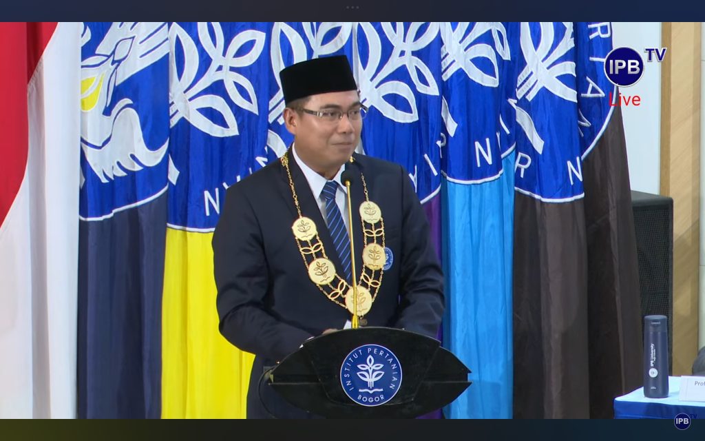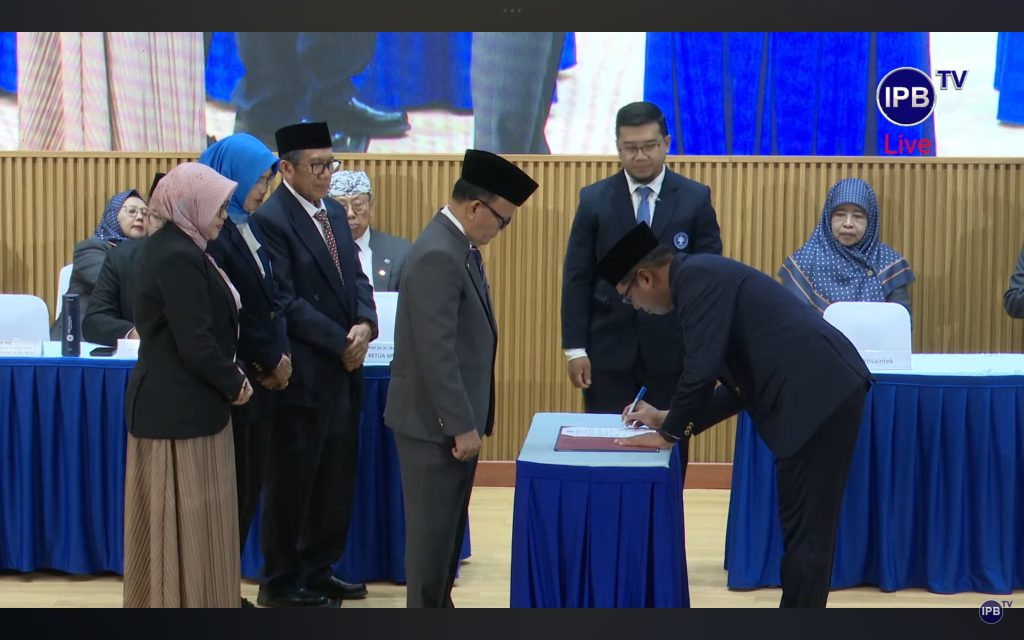“…Dengan penuh rasa tanggung jawab, menjaga integritas…,” ulang rektor baru itu mengucap sumpah dibimbing Ketua Majelis Wali Amanat (MWA). Dr. Alim Setiawan Slamet, S.TP., M.Si., mantan Wakil Rektor bidang Resiliensi Sumberdaya dan Infrastruktur (WR II), per Kamis (11/12), resmi dilantik menjadi rektor IPB University pengganti antar waktu (PAW). Pengangkatan ini mengekor dari penunjukkan Prof. Dr. Arif Satria, S.P., M.Si., rektor pendahulu, sebagai kepala Badan Riset dan Inovasi Nasional (BRIN) baru di Istana. Dinamika ini menyisakan rentetan “pekerjaan rumah” bertenggat tahun 2028 (sesuai periode kepemimpinan) yang ditumpahkan MWA dan Arif pada penerusnya.