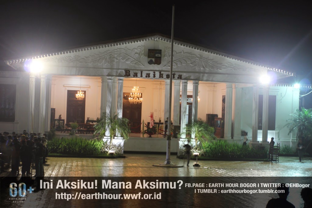 Earth Hour  adalah komunitas dunia yang mengajak orang-orang untuk bersama-sama menerapkan gaya hidup hijau. Sebagai simbolnya, Earth Hour punya momentum bersama untuk mematikan lampu selama 1 jam. Untuk tahun ini, seremonial tsb dilaksanakan pada tanggal 29 Maret 2014 pada pukul 20.30-21.30. Salah satu kota pendukung Earth Hour Indonesia adalah Kota Bogor. Maksud logo 60+ adalah setelah satu jam jadikan gaya hidup